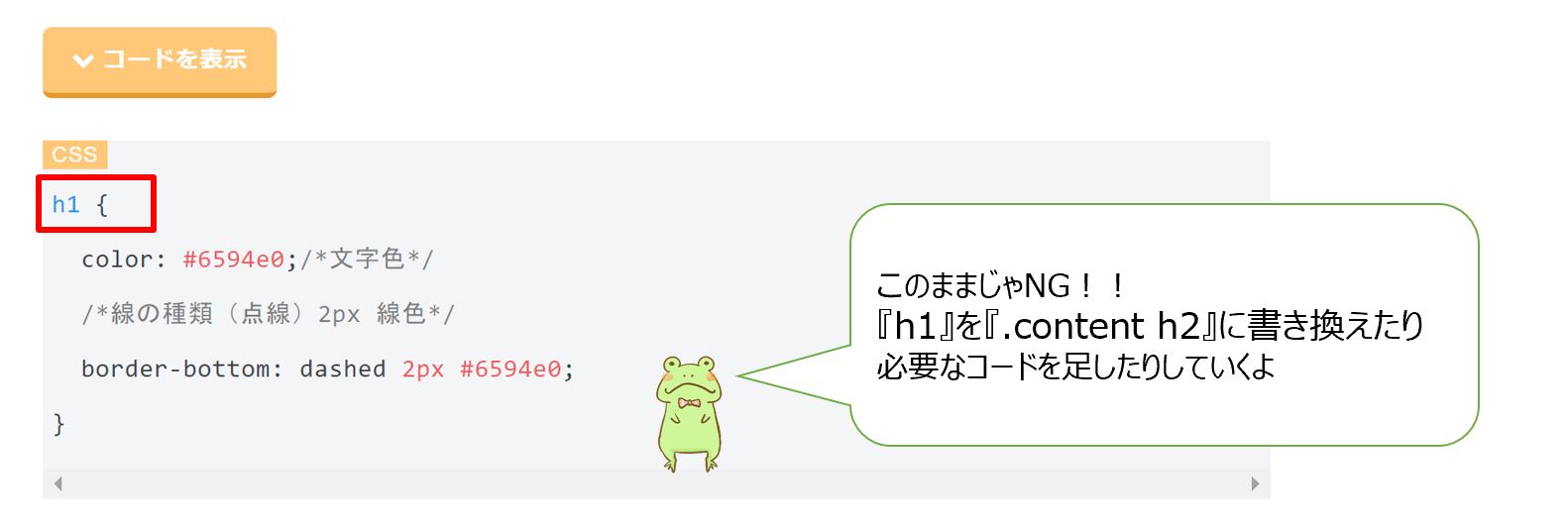 また、段落(h2など) の前に『.content 』を付け加えましょう。